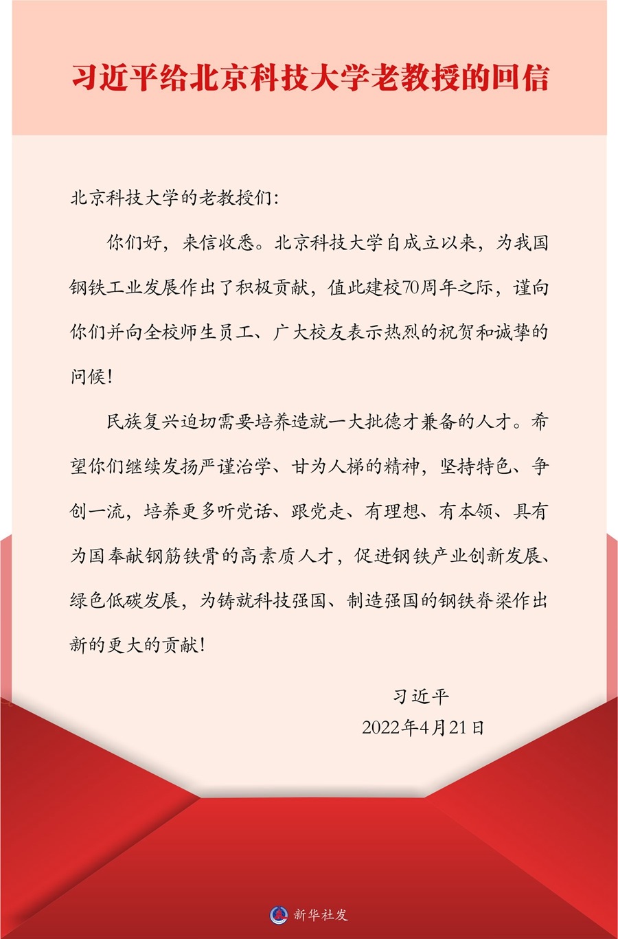 中共中央總書記、國家主席、中央軍委主席習近平4月21日給北京科技大學的老教授回信,對培養(yǎng)更多高素質(zhì)人才,促進鋼鐵產(chǎn)業(yè)創(chuàng)新發(fā)展、綠色低碳發(fā)展提出殷切期望。