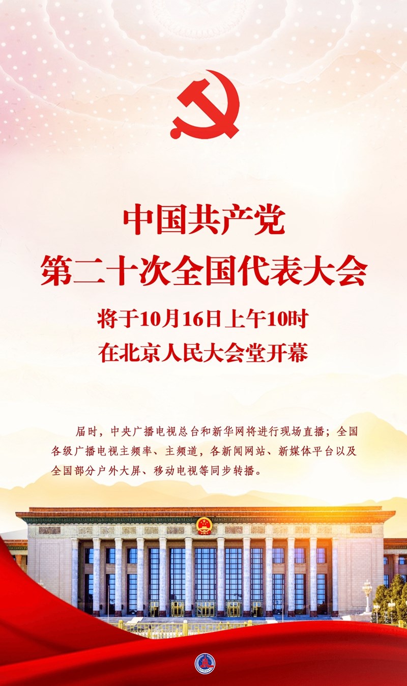 新華社北京10月14日電 中國共產(chǎn)黨第二十次全國代表大會(huì)將于16日上午10時(shí)在北京人民大會(huì)堂開幕。