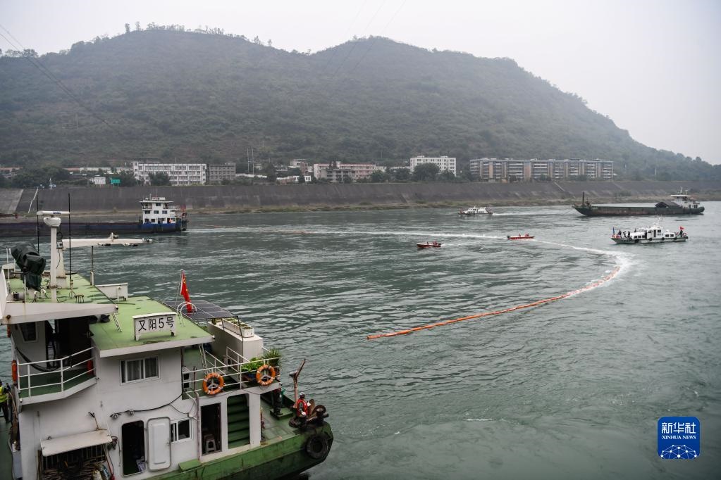 11月9日,在四川省宜賓市敘州區(qū)的長(zhǎng)江流域突發(fā)生態(tài)環(huán)境事件應(yīng)急綜合演練現(xiàn)場(chǎng),多方部門(mén)協(xié)作在金沙江面布設(shè)圍油欄。新華社記者 王曦 攝