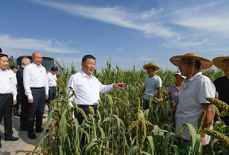 △2021年9月13日,習(xí)近平總書記在陜西米脂縣高西溝村臨時下車,察看糧食作物長勢,同正在田間勞作的老鄉(xiāng)拉家常。