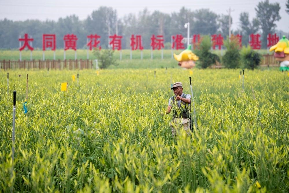 △村民在山西大同黃花有機(jī)標(biāo)準(zhǔn)化種植基地內(nèi)采摘黃花。