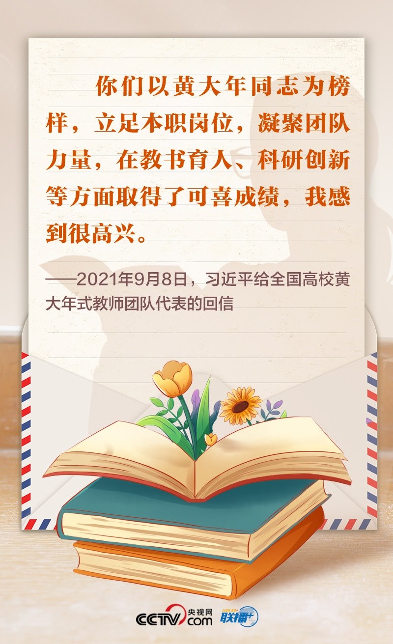 2021年,首批黃大年式教師團隊的代表給總書記寫信,匯報教學(xué)、科研等工作情況,表達了堅守教育報國理想、為民族復(fù)興貢獻力量的決心??倳浕匦趴隙舜蠹业墓ぷ鞒尚?,勉勵大家繼續(xù)學(xué)習(xí)弘揚黃大年同志等優(yōu)秀教師的高尚精神,立德修身,潛心治學(xué),開拓創(chuàng)新,真正把為學(xué)、為事、為人統(tǒng)一起來,當(dāng)好學(xué)生成長的引路人。