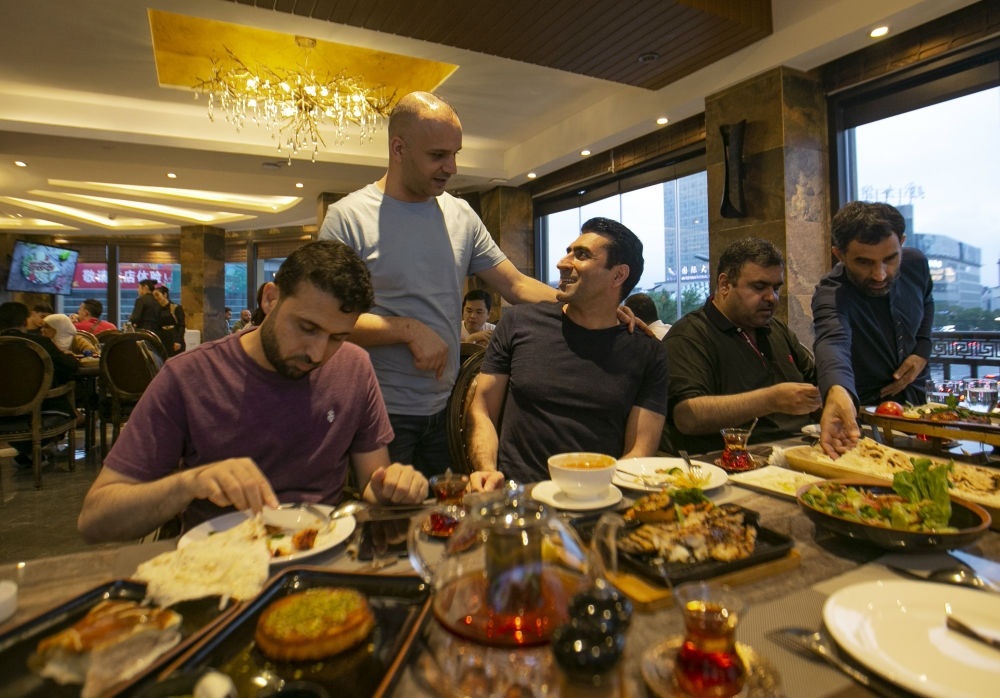 在義烏經(jīng)營(yíng)餐廳的約旦老板穆罕奈德(左二)與朋友們聊天,他2002年來(lái)到義烏創(chuàng)業(yè),并在此安家。