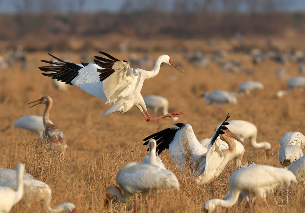 這是2021年1月15日在鄱陽(yáng)湖畔的江西余干縣康山墾殖場(chǎng)插旗洲拍攝的白鶴。隨著長(zhǎng)江重點(diǎn)水域生態(tài)修復(fù)措施的落實(shí),鄱陽(yáng)湖環(huán)境正發(fā)生嬗變。江西鄱陽(yáng)湖國(guó)家級(jí)自然保護(hù)區(qū)管理局2022年新年伊始發(fā)布的鄱陽(yáng)湖區(qū)最新鳥(niǎo)情數(shù)據(jù)顯示,工作人員在野外監(jiān)測(cè)統(tǒng)計(jì)到水鳥(niǎo)76.6萬(wàn)余只,創(chuàng)有監(jiān)測(cè)記錄以來(lái)新高。