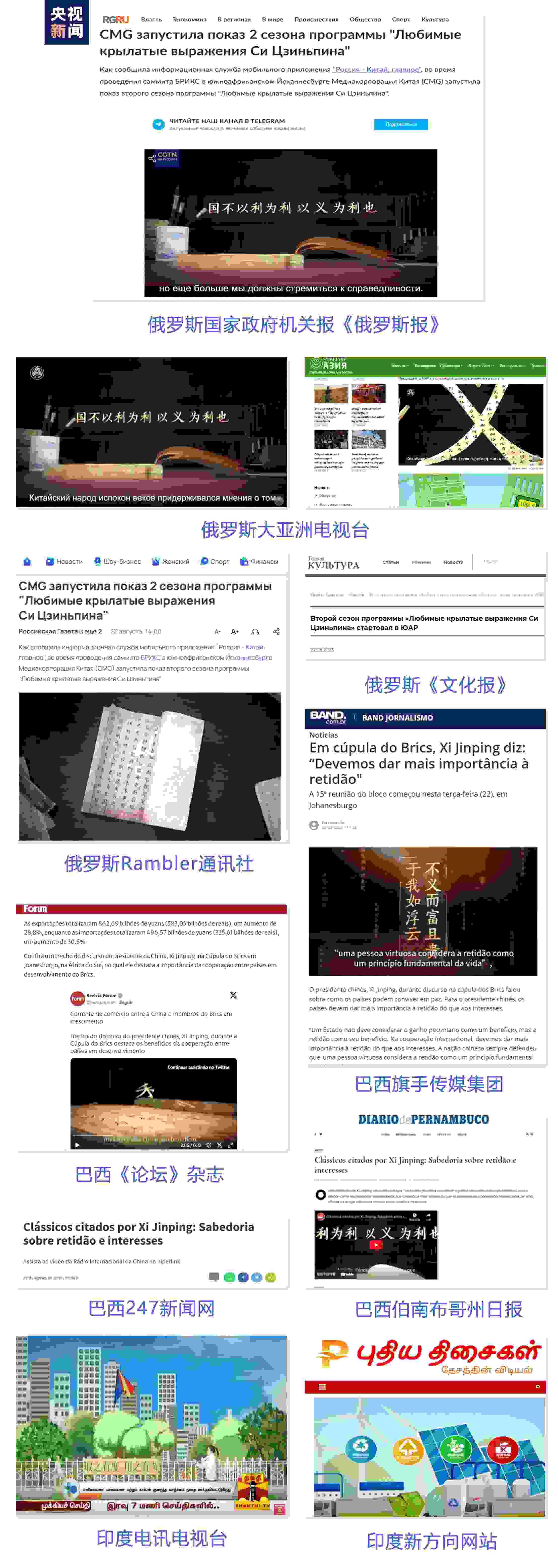 正值金磚國家領(lǐng)導(dǎo)人第十五次會晤在南非舉行,《平“語”近人——習(xí)近平喜歡的典故》第二季俄語、葡萄牙語、印地語、泰米爾語等版本同步在巴西、俄羅斯、印度等金磚國家落地播出。俄羅斯國家政府機關(guān)報《俄羅斯報》、俄羅斯大亞洲電視臺、俄羅斯Rambler通訊社、俄羅斯《文化報》、巴西旗手傳媒集團、巴西《論壇》雜志、巴西伯南布哥州日報、巴西247新聞網(wǎng)、孟買信使報、印度新方向網(wǎng)站等金磚國家主流媒體紛紛轉(zhuǎn)發(fā)轉(zhuǎn)載。