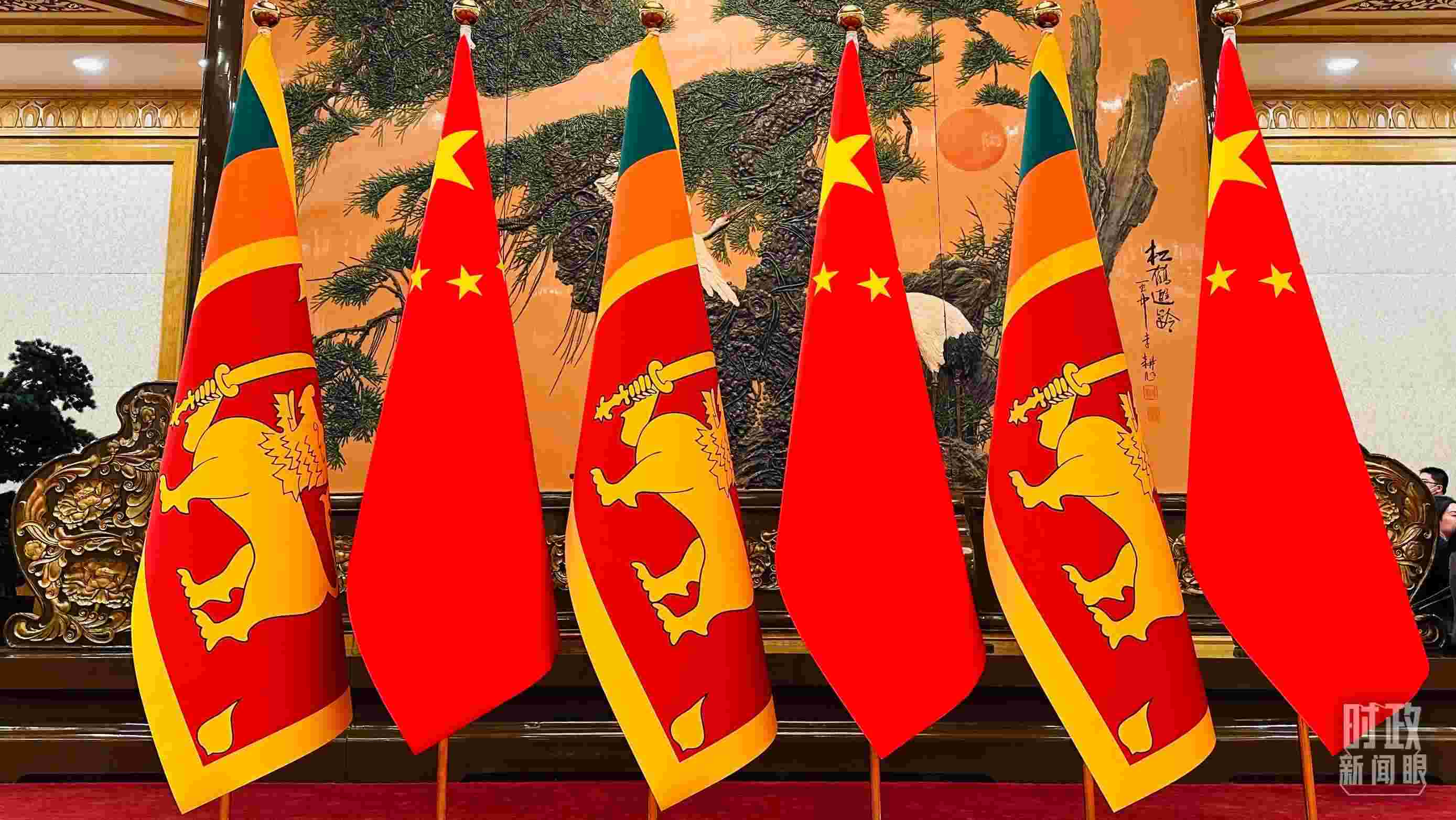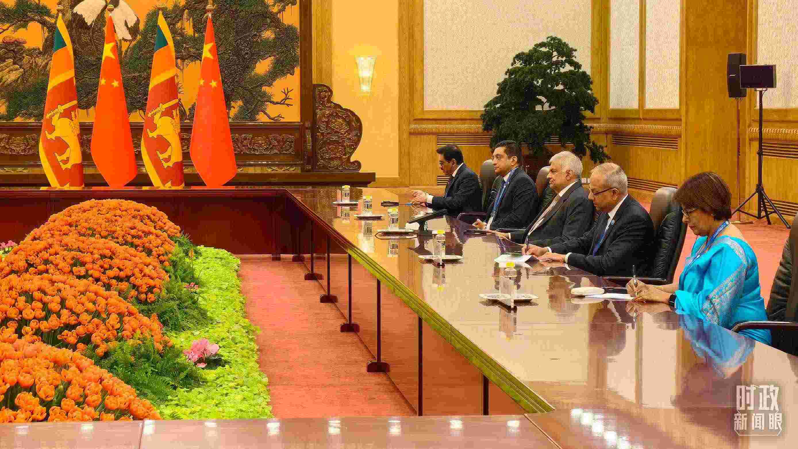△會(huì)見現(xiàn)場(chǎng)擺放的中國(guó)、斯里蘭卡國(guó)旗。(總臺(tái)央視記者范一鳴拍攝)
