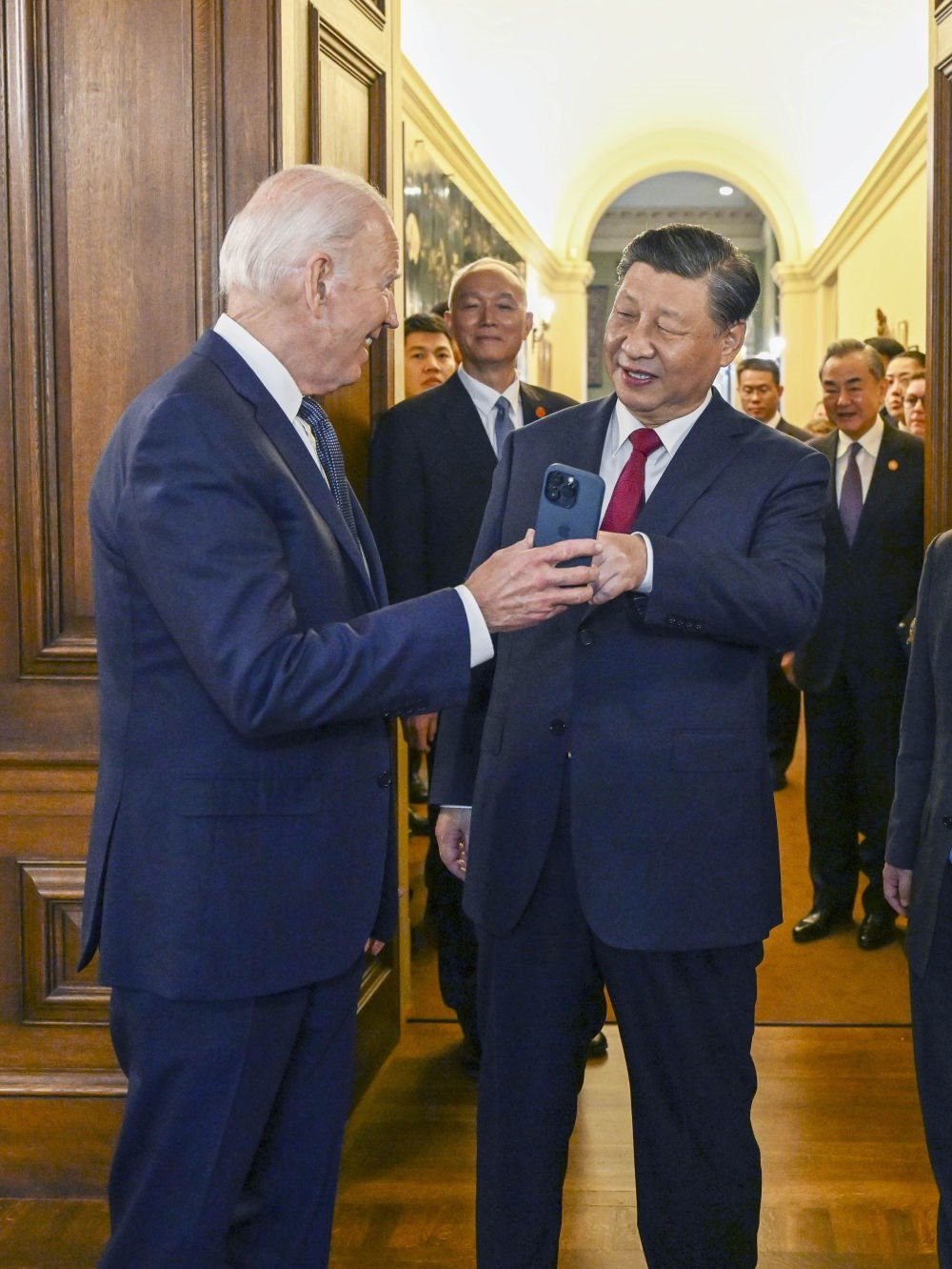 當?shù)貢r間11月15日中午,美國舊金山郊外的斐洛里莊園,習近平主席結(jié)束同美國總統(tǒng)拜登的晤談,出席拜登總統(tǒng)舉行的宴會。這是拜登在手機上展示1985年習近平在擔任正定縣委書記時訪問舊金山的一張照片。新華社記者 李學仁 攝