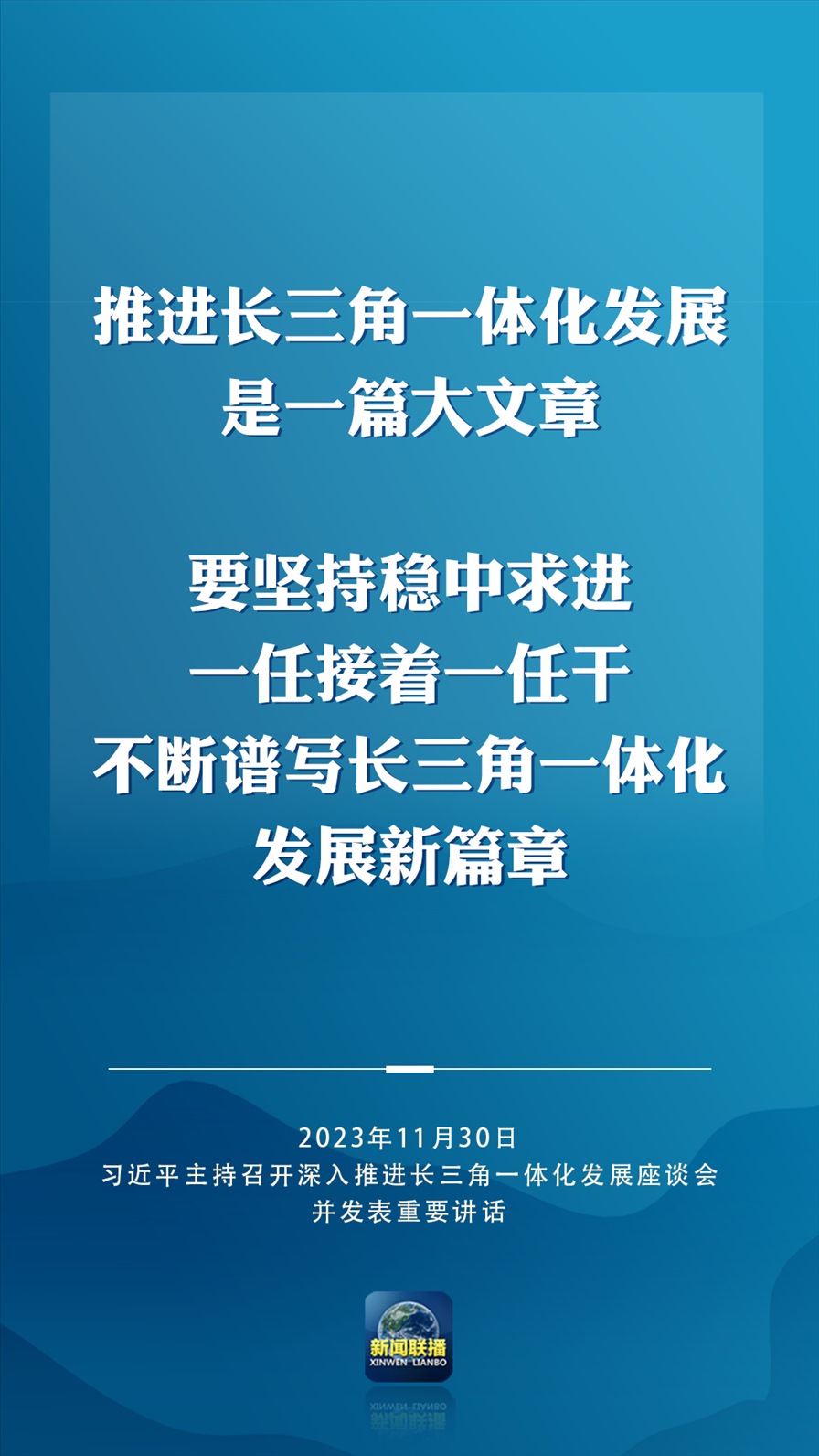 習(xí)近平強(qiáng)調(diào),要完整、準(zhǔn)確、全面貫徹新發(fā)展理念,緊扣一體化和高質(zhì)量這兩個(gè)關(guān)鍵詞,樹(shù)立全球視野和戰(zhàn)略思維,堅(jiān)定不移深化改革、擴(kuò)大高水平開(kāi)放,統(tǒng)籌科技創(chuàng)新和產(chǎn)業(yè)創(chuàng)新,統(tǒng)籌龍頭帶動(dòng)和各揚(yáng)所長(zhǎng),統(tǒng)籌硬件聯(lián)通和機(jī)制協(xié)同,統(tǒng)籌生態(tài)環(huán)保和經(jīng)濟(jì)發(fā)展,在推進(jìn)共同富裕上先行示范,在建設(shè)中華民族現(xiàn)代文明上積極探索,推動(dòng)長(zhǎng)三角一體化發(fā)展取得新的重大突破,在中國(guó)式現(xiàn)代化中走在前列,更好發(fā)揮先行探路、引領(lǐng)示范、輻射帶動(dòng)作用。