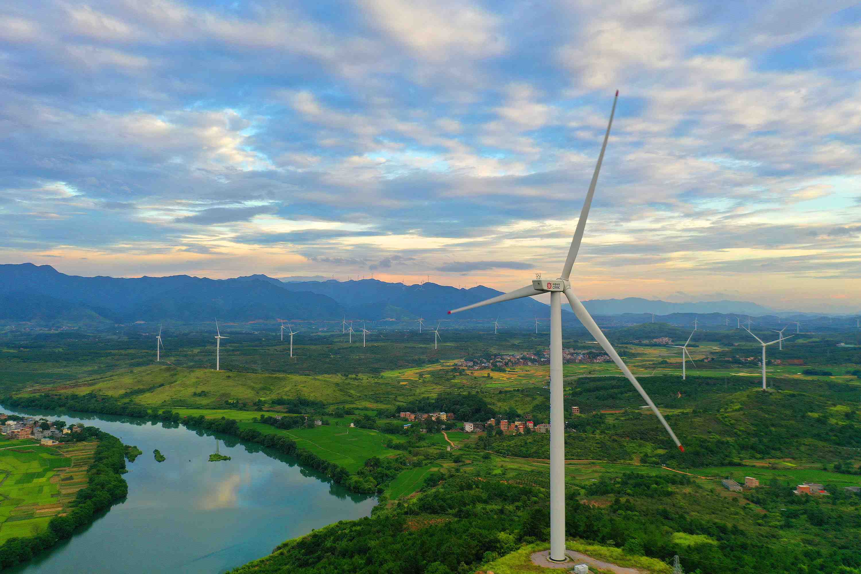 △ 湖南省永州市的風力發(fā)電風車與藍天、綠水、田野交相輝映,構(gòu)成一幅美麗的生態(tài)畫卷。
