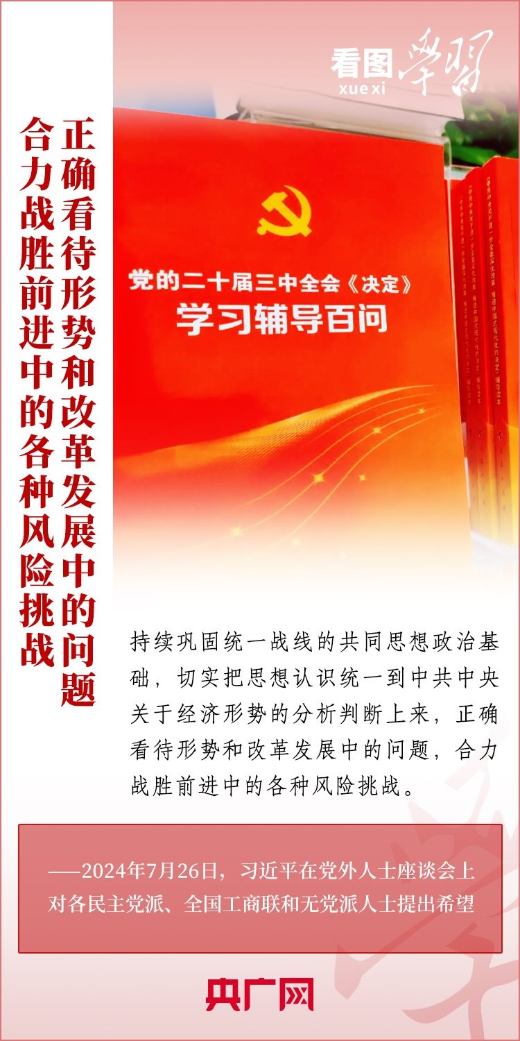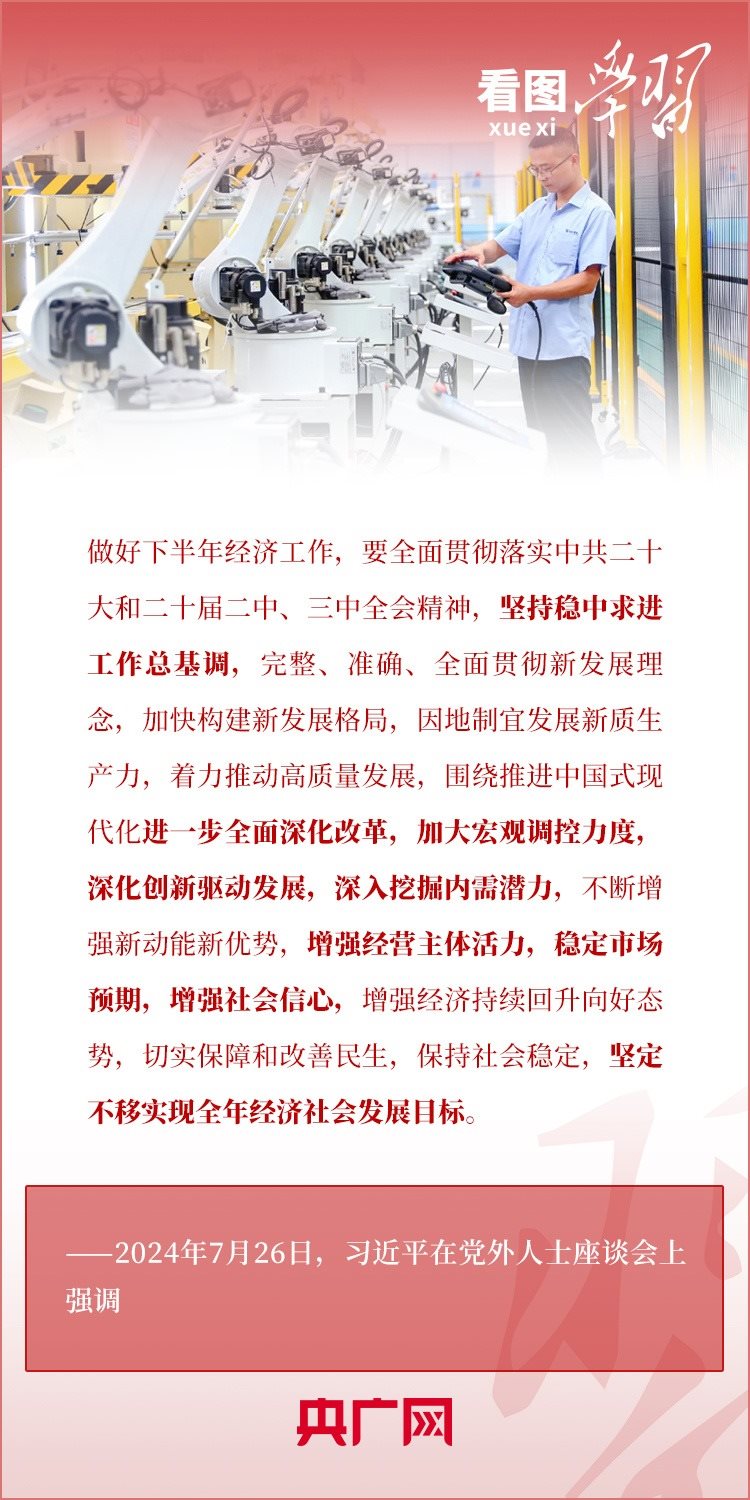 中共中央7月26日在中南海召開(kāi)黨外人士座談會(huì),就當(dāng)前經(jīng)濟(jì)形勢(shì)和下半年經(jīng)濟(jì)工作聽(tīng)取各民主黨派中央、全國(guó)工商聯(lián)負(fù)責(zé)人和無(wú)黨派人士代表的意見(jiàn)和建議。習(xí)近平總書(shū)記主持座談會(huì)并發(fā)表重要講話,對(duì)做好下半年經(jīng)濟(jì)工作作出重要部署,并對(duì)黨外人士提出3點(diǎn)希望。一起來(lái)學(xué)習(xí)!