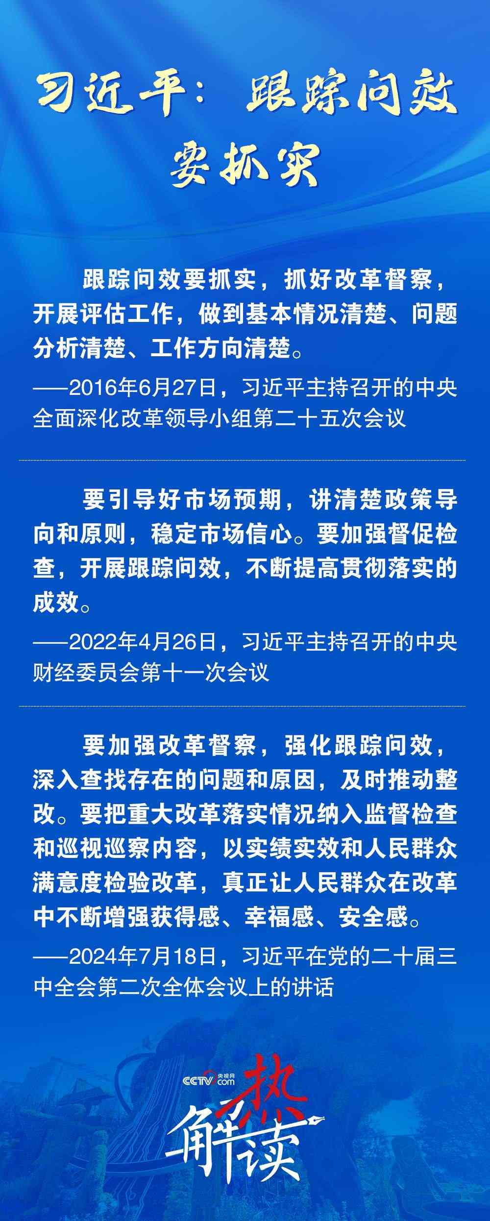 今年7月,在黨的二十屆三中全會第二次全體會議上,習(xí)近平總書記進(jìn)一步提出,要強(qiáng)化跟蹤問效,深入查找存在的問題和原因,及時推動整改。