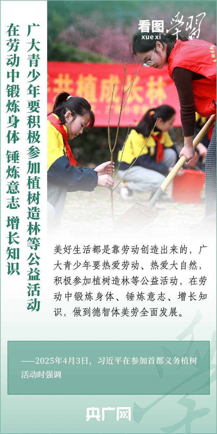 植樹造林是生態(tài)文明建設(shè)重要一環(huán)。4月3日,習(xí)近平總書記參加首都義務(wù)植樹活動。在植樹現(xiàn)場,總書記高度肯定國土綠化工作取得來之不易的成績,強調(diào)綠化祖國必須堅持“三綠”并舉、“四庫”聯(lián)動,要更加注重“提質(zhì)”“興業(yè)”“利民”,“匯聚共建美麗中國的磅礴力量,讓祖國大地更加綠意盎然、生機勃發(fā)”。一起來學(xué)習(xí)!