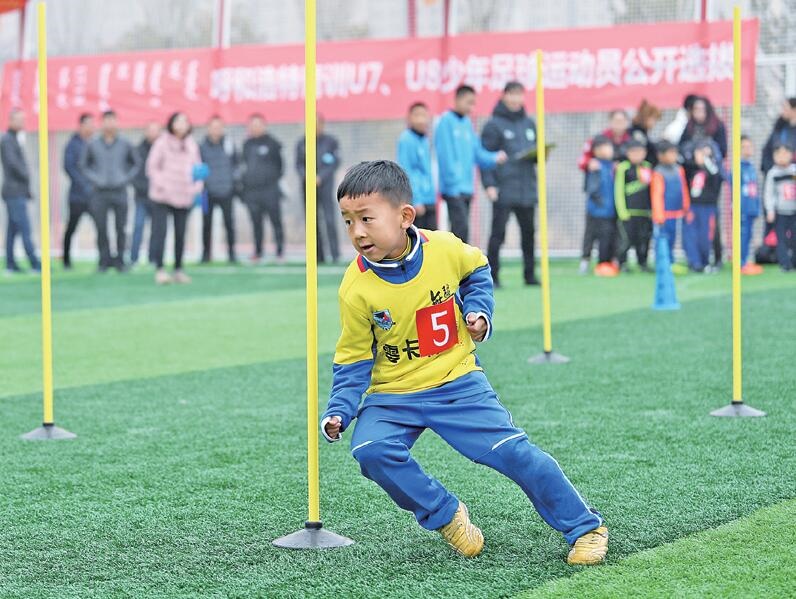 連續(xù)兩天的雨雪天氣沒有澆熄孩子們的熱情,球場上一群六七歲的小朋友努力奔跑著。日前,在呼和浩特市賽罕區(qū)全民健身中心、新城區(qū)成吉思汗街小學(xué)、玉泉區(qū)通順街小學(xué)、賽罕區(qū)騰飛路小學(xué)4個(gè)地點(diǎn)進(jìn)行了呼和浩特市2011—2012年齡段男子足球隊(duì)員的選拔。孩子們雖然動作稚嫩、但個(gè)個(gè)都表情認(rèn)真,全力以赴地進(jìn)行著測試。