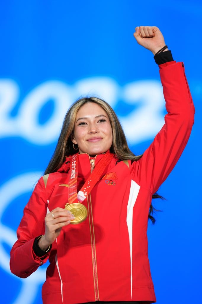 2月8日,冠軍中國選手谷愛凌在北京2022年冬奧會自由式滑雪女子大跳臺獎(jiǎng)牌頒發(fā)儀式上。新華社記者鞠煥宗攝