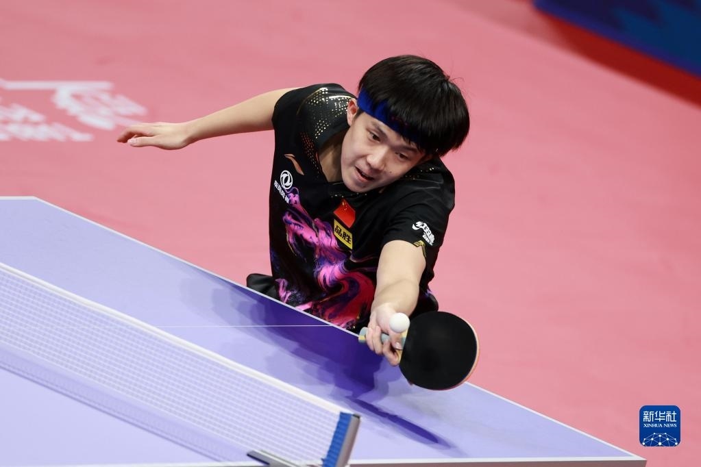 2022年10月9日,中國隊(duì)選手王楚欽在比賽中回球,他以3:0戰(zhàn)勝德國隊(duì)選手凱·斯達(dá)姆珀。當(dāng)日,在成都世乒賽男團(tuán)決賽中,中國乒乓球男隊(duì)3:0戰(zhàn)勝德國隊(duì)。 新華社記者胥冰潔攝