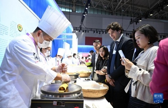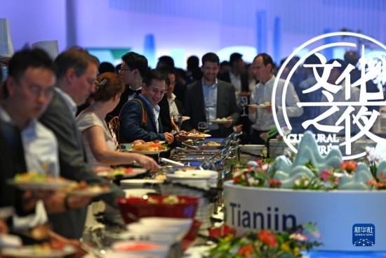 6月27日,與會(huì)嘉賓在第十四屆夏季達(dá)沃斯論壇文化之夜現(xiàn)場(chǎng)了解天津特色美食。