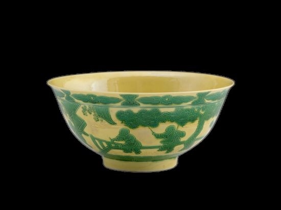 清同治·景德鎮(zhèn)窯黃地綠釉嬰戲圖碗。色地彩瓷是以各種不同的顏色釉為地,再施一種彩為飾,各種色彩互相交錯使用,形成“一地一彩”的瓷器,如黃地綠彩、綠地紫彩、綠地黃彩、紅地黃彩、紫地綠彩等多種色地彩瓷。屬低溫彩釉,最早在明代永樂時期出現(xiàn)。(圖片來源:上海博物館)