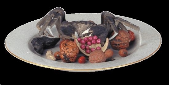 清乾隆·粉彩像生瓷果品盤。盤中諸果品不但酷似實物,而且都具有吉祥含義,如螃蟹寓意“一甲”,即科舉殿試第一;荔枝樹有“經(jīng)四百余年猶能結(jié)實者”之說,象征長壽;核桃、石榴是多子多福的象征;而棗、花生、瓜子等則寓意“早生貴子”。(圖片來源:故宮博物院)