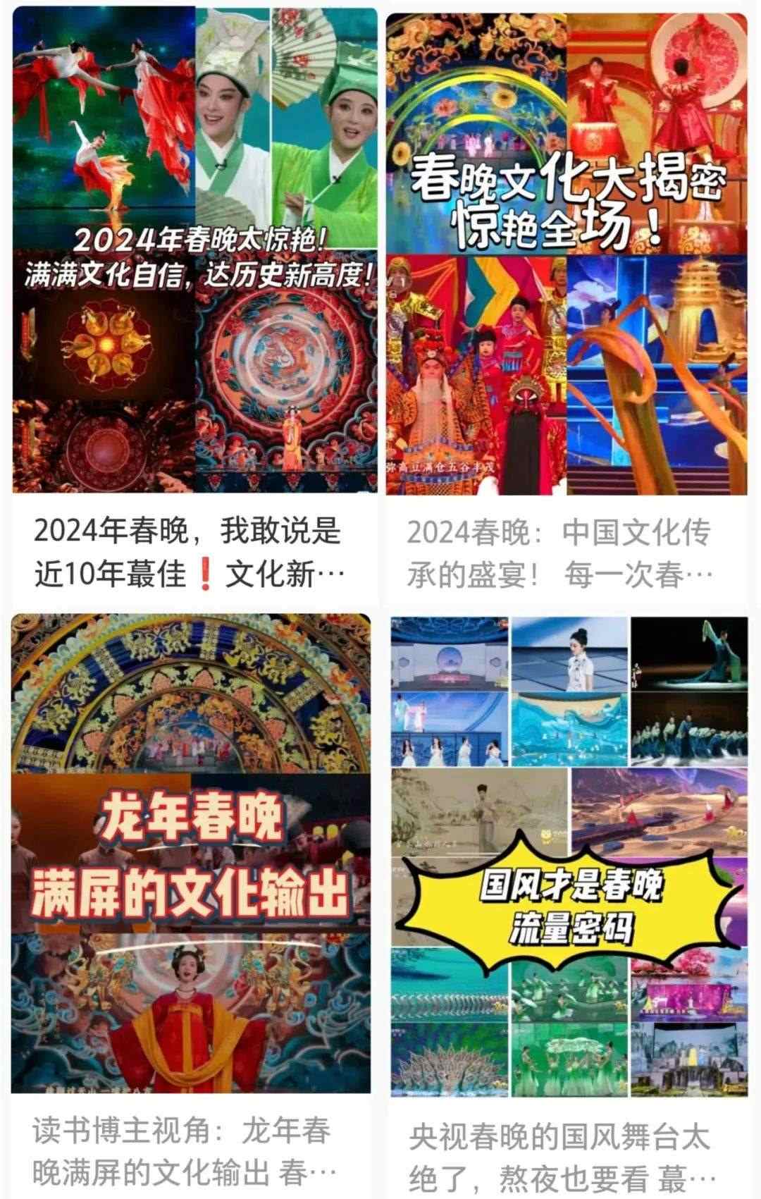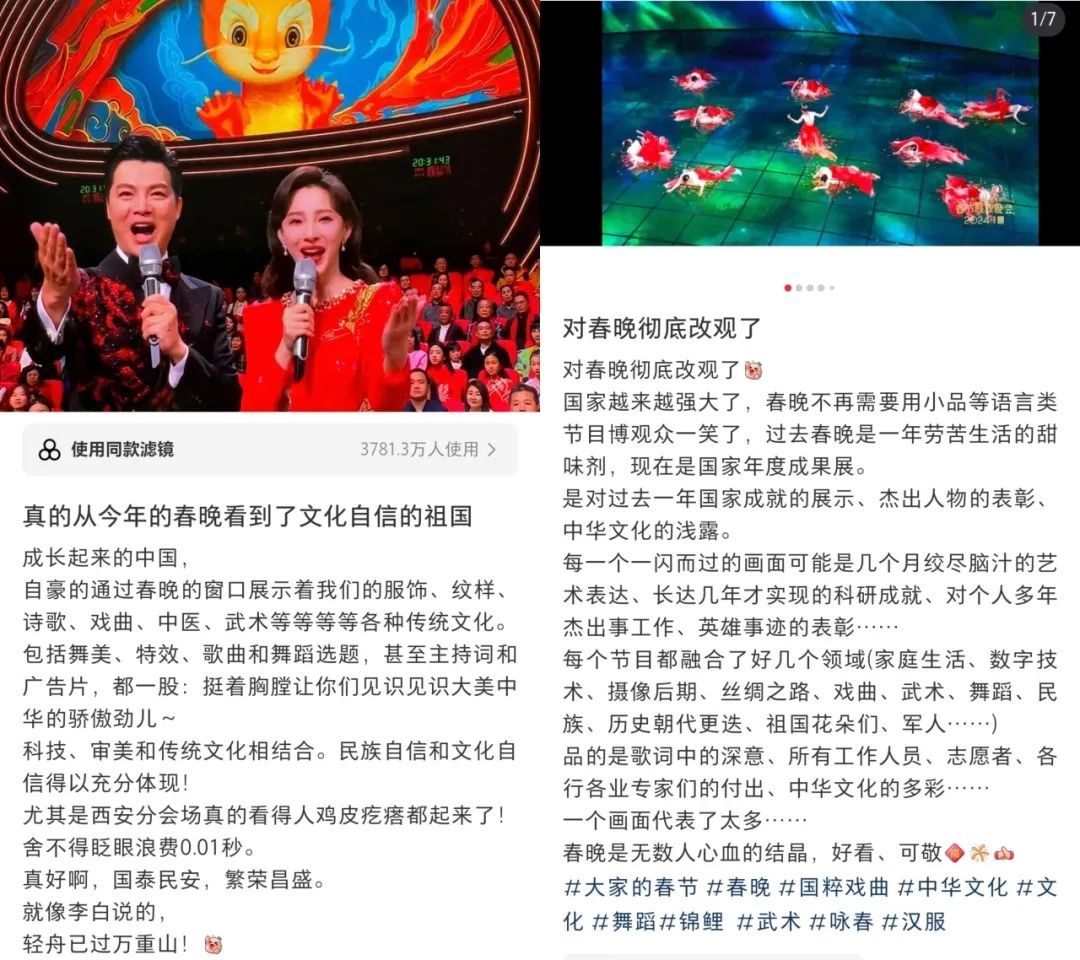 春晚的文化展現(xiàn),在國人中也引起了熱烈反響。“每一個文化類節(jié)目都蘊含著獨特的中國之美,這種美有的跨越千年,有的多經(jīng)磨難,春晚給我們呈現(xiàn)了一場場宏大的視聽盛宴,作為觀眾很難不動容”“從今年春晚真真切切地感受到了文化自信,大好河山,傳統(tǒng)文化,國家強盛,美美與共”“文化傳統(tǒng)特色給各個節(jié)目都刷了創(chuàng)意的漆,霸氣從節(jié)目中升騰,自信從感嘆中生發(fā),真妙”......
