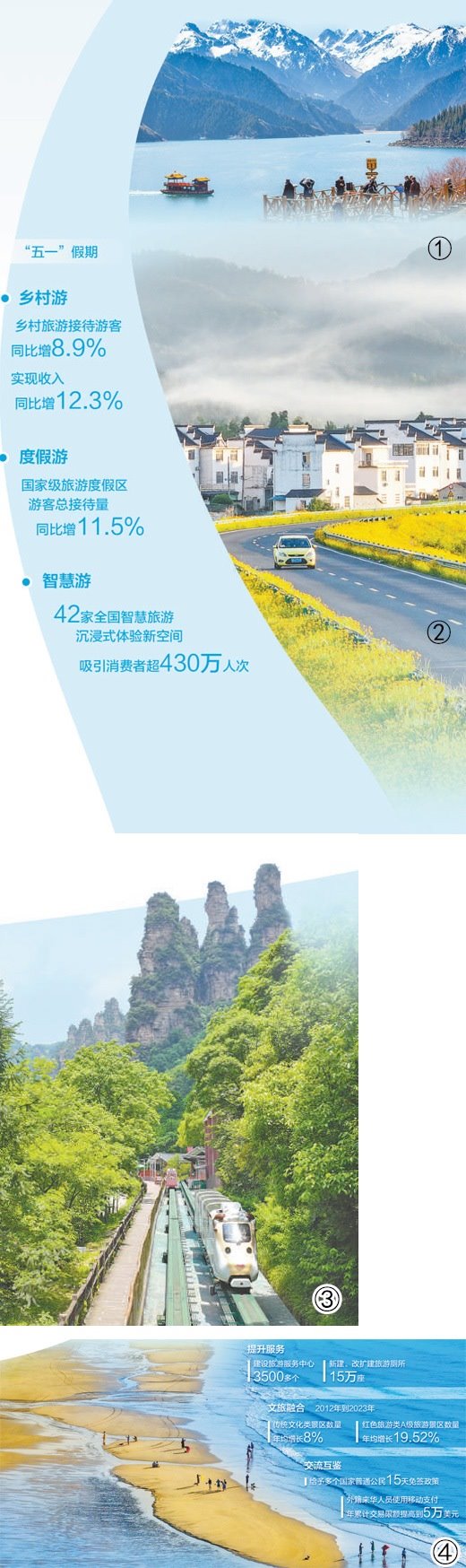 圖①:新疆天池景區(qū)。張 昀攝(影像中國) 圖②:安徽黃山休寧縣鄉(xiāng)村風光。施亞磊攝(影像中國)圖③:湖南張家界國家森林公園。吳勇兵攝(影像中國) 圖④:海南萬寧石梅灣。劉國興攝(影像中國)數(shù)據來源:文化和旅游部等