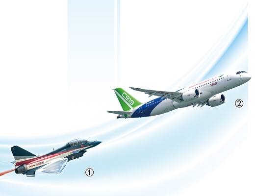 圖①:殲—10戰(zhàn)機(jī)。中國航空博物館供圖 圖②:C919國產(chǎn)大飛機(jī)。徐炳南攝