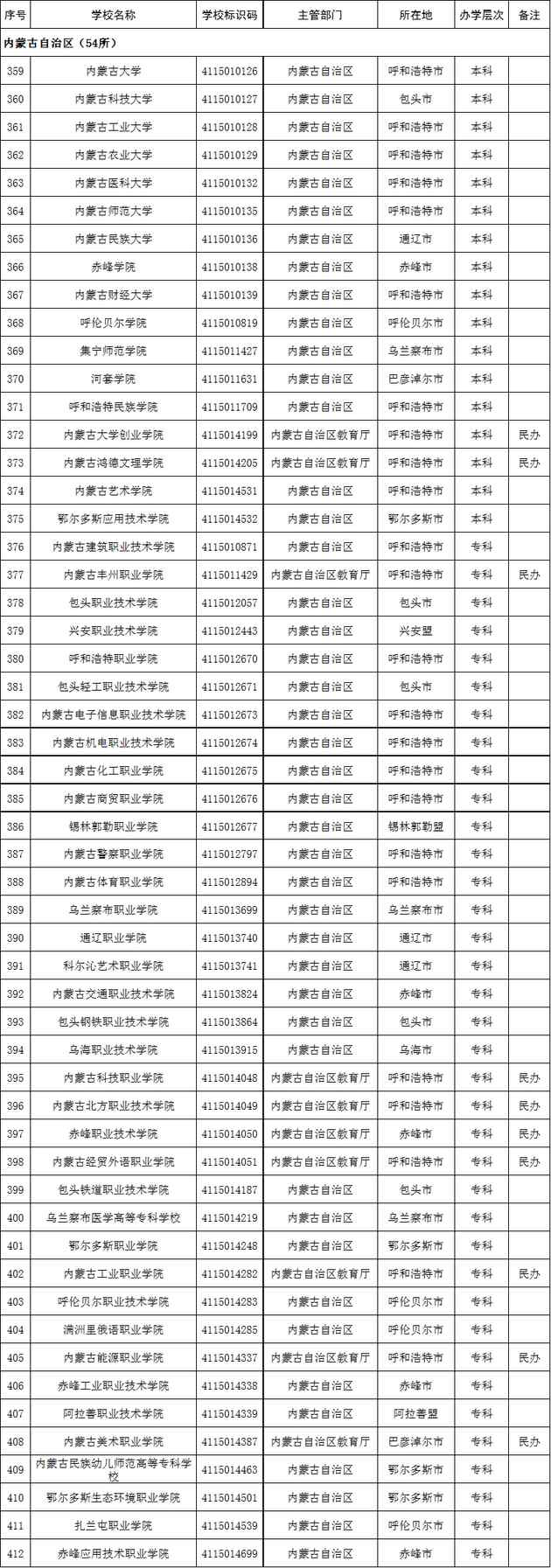 截至2020年6月30日,全國高等學(xué)校共計(jì)3005所,其中:普通高等學(xué)校2740所,含本科院校1258所、高職(??疲┰盒?482所;成人高等學(xué)校265所。本名單未包含港澳臺地區(qū)高等學(xué)校。以下為內(nèi)蒙古自治區(qū)2020年普通高等學(xué)校名單(54所)。