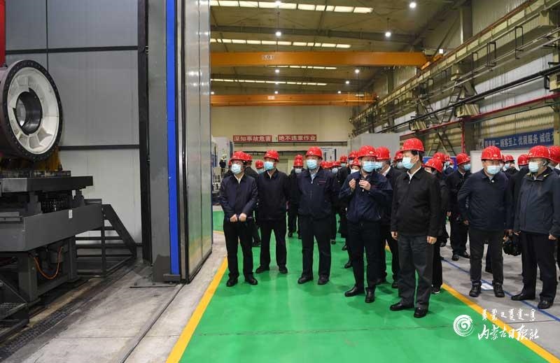 4月21日,自治區(qū)黨委書(shū)記、人大常委會(huì)主任石泰峰,與參加自治區(qū)推動(dòng)高質(zhì)量發(fā)展重大項(xiàng)目建設(shè)動(dòng)員大會(huì)的代表一起觀摩南高齒(包頭)傳動(dòng)設(shè)備有限公司風(fēng)電齒輪箱二期擴(kuò)建項(xiàng)目。內(nèi)蒙古日?qǐng)?bào)社融媒體記者 袁永紅 攝