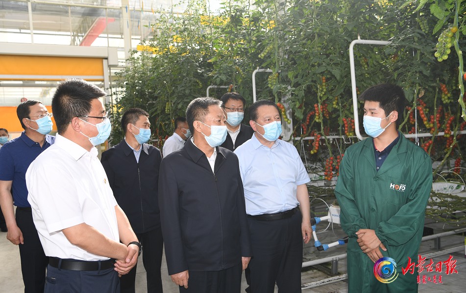 孫紹騁走進(jìn)宏?,F(xiàn)代農(nóng)業(yè)產(chǎn)業(yè)園無土栽培番茄智能化溫室,詳細(xì)了解土地流轉(zhuǎn)、產(chǎn)品銷售、項目建設(shè)及帶動就業(yè)等情況。內(nèi)蒙古日報社融媒體記者袁永紅攝