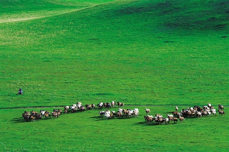 綠韻,疊翠流淌。保生態(tài)、治污染、促轉(zhuǎn)型,讓廣袤草原“帶薪休假”,在興安林海“掛斧停鋸”,對重點沙漠“鎖邊治理”,累計營造林1.22億畝、種草2.86億畝,年均防沙治沙1200萬畝以上,各族兒女義不容辭扛起保護生態(tài)環(huán)境重大責(zé)任,厚植“北疆綠”、增色“中國藍(lán)”。