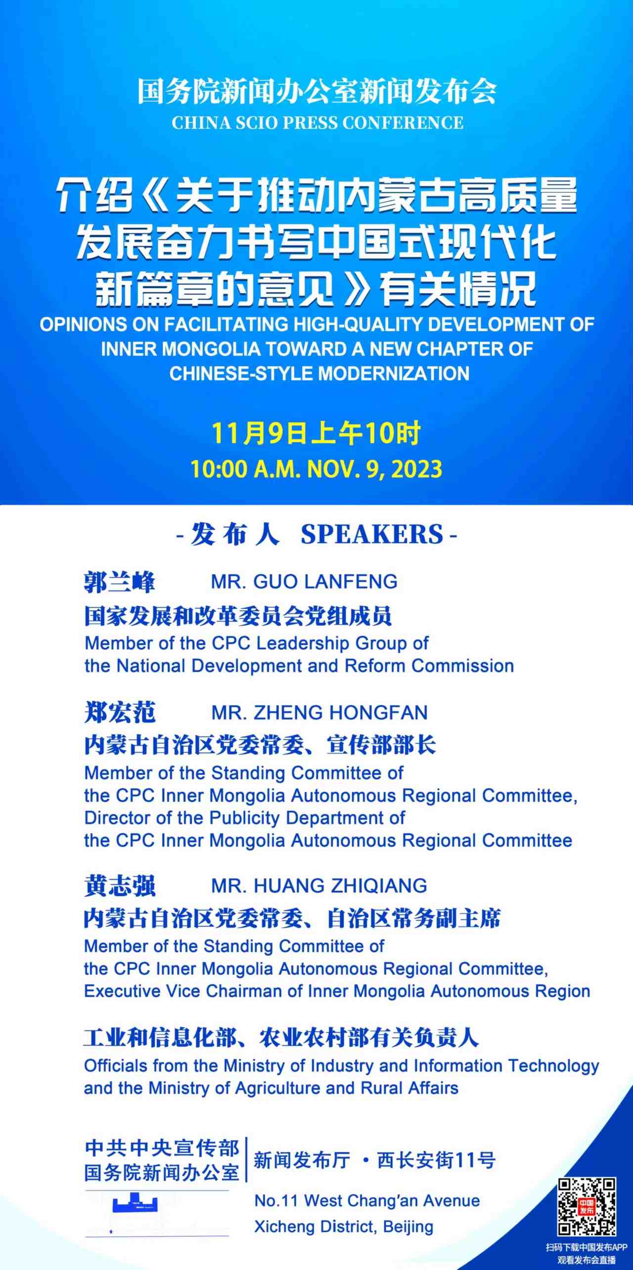 2023年11月9日(星期四)上午10時(shí),國務(wù)院新聞辦公室舉行新聞發(fā)布會(huì),請(qǐng)國家發(fā)展和改革委員會(huì)黨組成員郭蘭峰,內(nèi)蒙古自治區(qū)黨委常委、宣傳部部長鄭宏范,內(nèi)蒙古自治區(qū)黨委常委、自治區(qū)常務(wù)副主席黃志強(qiáng)和工業(yè)和信息化部、農(nóng)業(yè)農(nóng)村部有關(guān)負(fù)責(zé)人介紹《關(guān)于推動(dòng)內(nèi)蒙古高質(zhì)量發(fā)展奮力書寫中國式現(xiàn)代化新篇章的意見》有關(guān)情況,并答記者問。