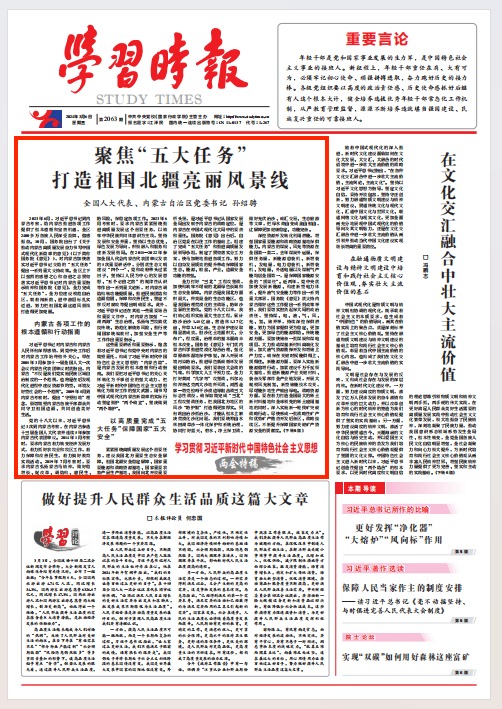 《學(xué)習(xí)時報》2024年3月6日第1版刊發(fā)全國人大代表、內(nèi)蒙古自治區(qū)黨委書記孫紹騁文章《聚焦“五大任務(wù)”打造祖國北疆亮麗風(fēng)景線》。