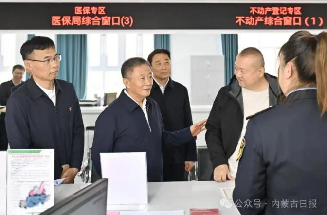 6月16日,自治區(qū)黨委書記孫紹騁來(lái)到阿爾山市政務(wù)服務(wù)和大數(shù)據(jù)中心,同辦事群眾和工作人員進(jìn)行交流,實(shí)地了解基層職能職責(zé)、減負(fù)效果等情況。草原云·內(nèi)蒙古新聞網(wǎng)記者