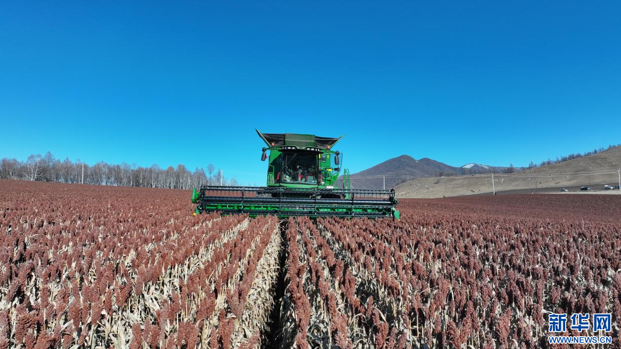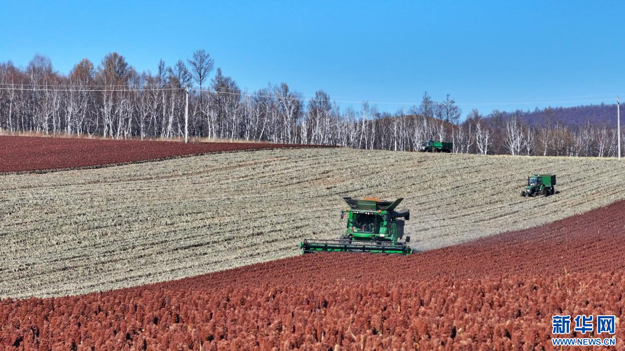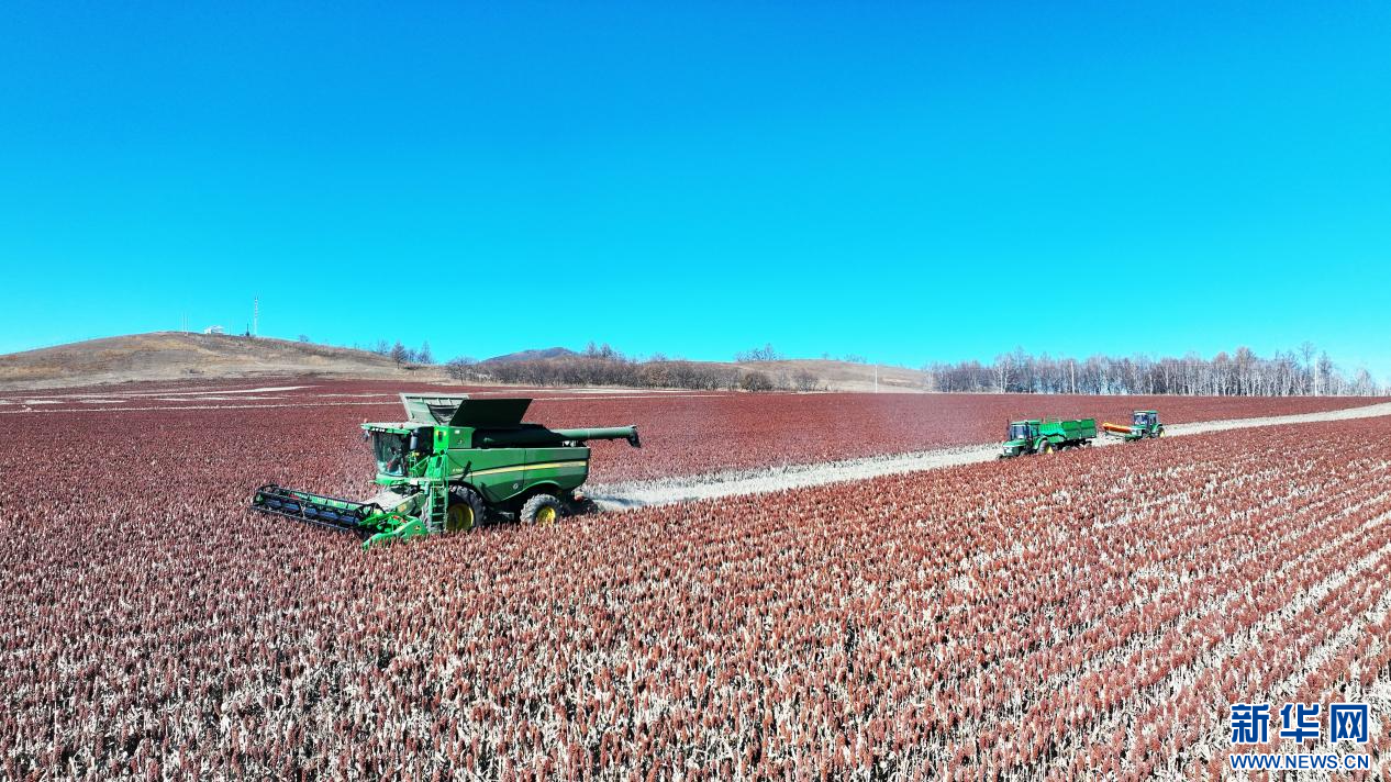 ??10月22日,在內蒙古自治區(qū)呼倫貝爾農墾綽爾河農牧場有限公司田間,農場員工正在收獲高粱。新華網(wǎng)發(fā)(哈園碩 攝)