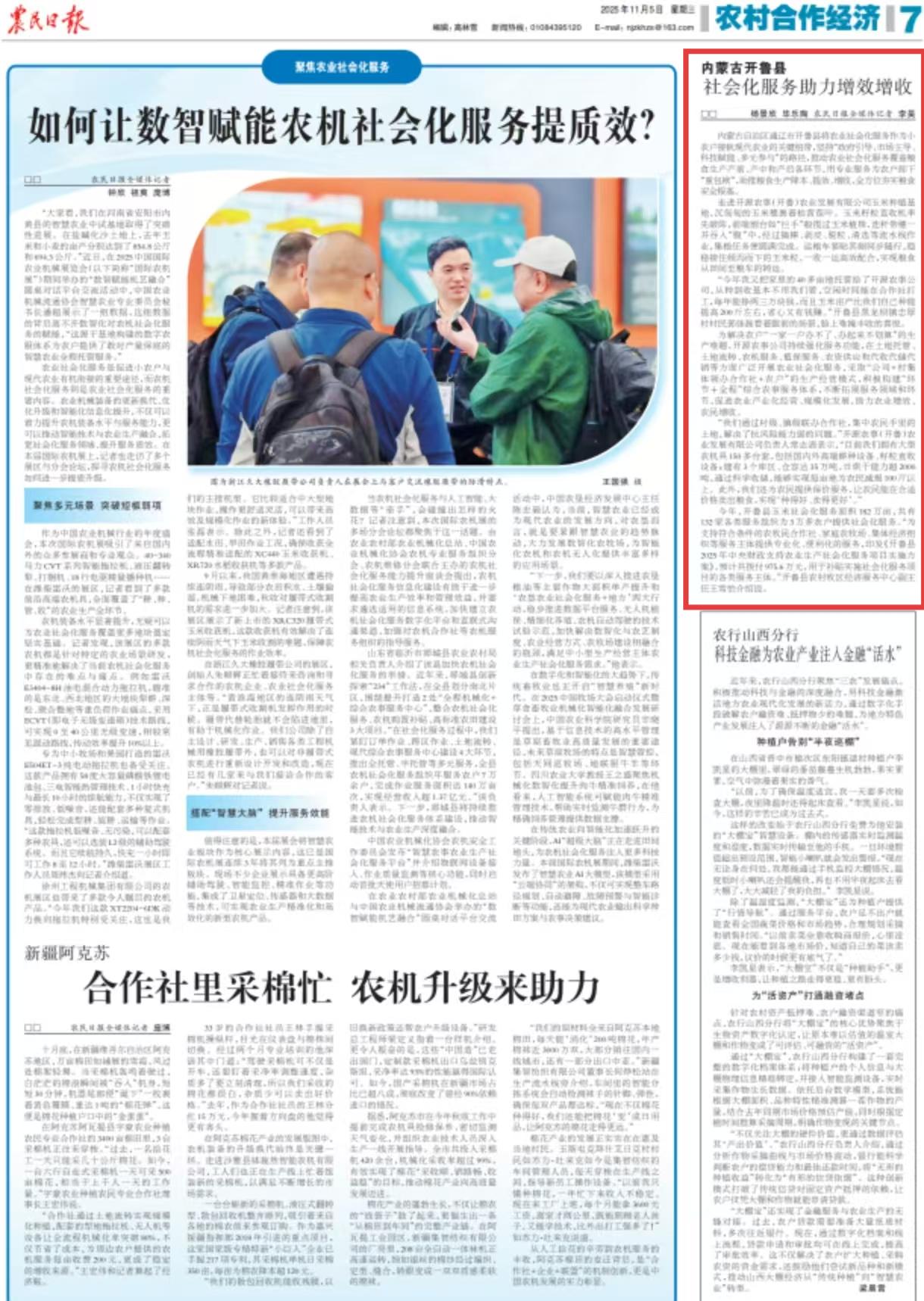 2025年11月5日,《農(nóng)民日?qǐng)?bào)》第7版刊發(fā)題為《內(nèi)蒙古開(kāi)魯縣:社會(huì)化服務(wù)助力增效增收》的文章,報(bào)道了今年以來(lái),內(nèi)蒙古開(kāi)魯縣玉米社會(huì)化服務(wù)面積182萬(wàn)畝,共有132家各類服務(wù)組織為3萬(wàn)多農(nóng)戶提供社會(huì)化服務(wù)。