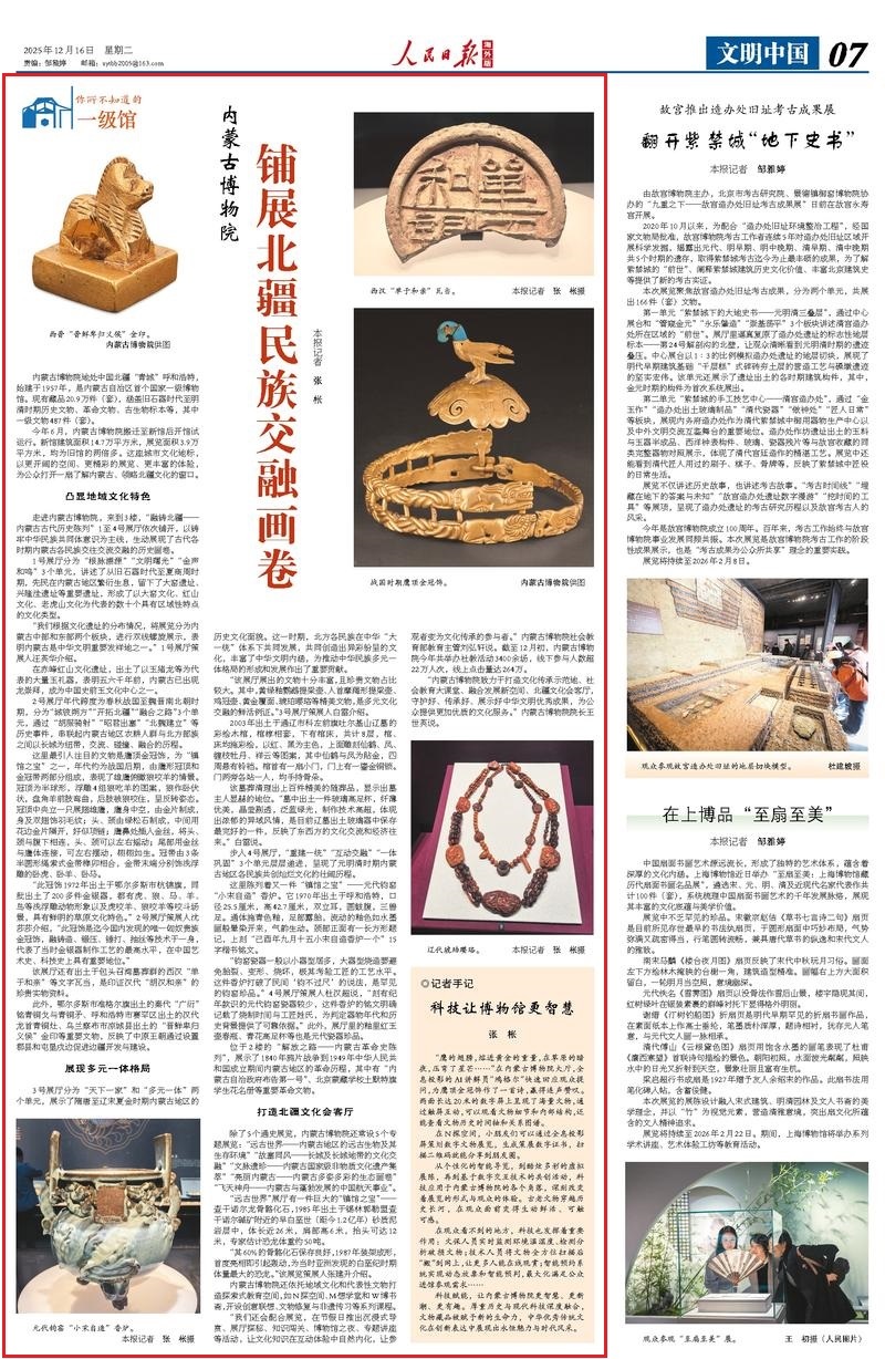 12月16日,《人民日報海外版》刊發(fā)《內蒙古博物院 鋪展北疆民族交融畫卷》,報道內蒙古自治區(qū)首個國家一級博物館今年6月搬遷至新館后開館試運行。新館建筑面積14.7萬平方米,展覽面積3.9萬平方米,均為舊館的兩倍多。這座城市文化地標,以更開闊的空間、更精彩的展覽、更豐富的體驗,為公眾打開一扇了解內蒙古、領略北疆文化的窗口。