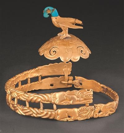 戰(zhàn)國時期鷹頂金冠飾。內蒙古博物院供圖