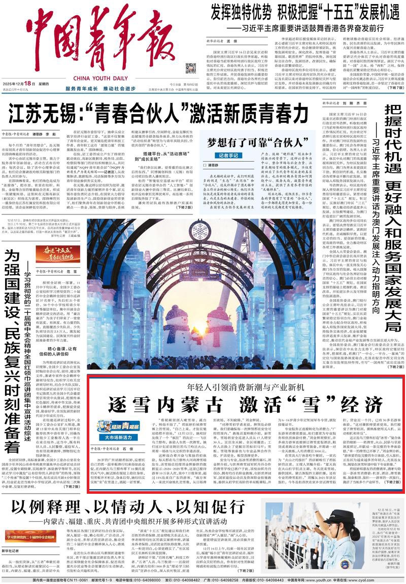 2025年12月18日《中國青年報(bào)》第1版刊發(fā)了《大市場新活力 年輕人引領(lǐng)消費(fèi)新潮與產(chǎn)業(yè)新機(jī) 逐雪內(nèi)蒙古 激活“雪”經(jīng)濟(jì)》的文章,報(bào)道了烏蘭察布大河灣滑雪場是打造“冰雪+”復(fù)合體驗(yàn)的縮影——將滑雪、火山、民俗與草原深度綁定,串聯(lián)成一條完整的冬季體驗(yàn)鏈。