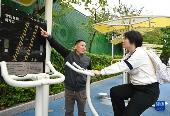 4月24日,西河智慧體育公園工作人員(左)向晨練的市民介紹具備對運(yùn)動數(shù)據(jù)進(jìn)行采集、分析等多項功能的智能競賽健身車。