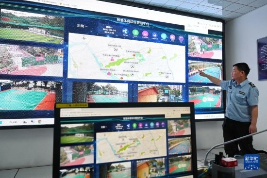 4月24日,西河智慧體育公園工作人員在介紹智慧體育綜合管控平臺。該平臺可對公園內(nèi)的人流、安全、環(huán)境以及公園周邊“15分鐘健身圈”運(yùn)動場地的門禁、燈光等設(shè)備實現(xiàn)智能化管理。