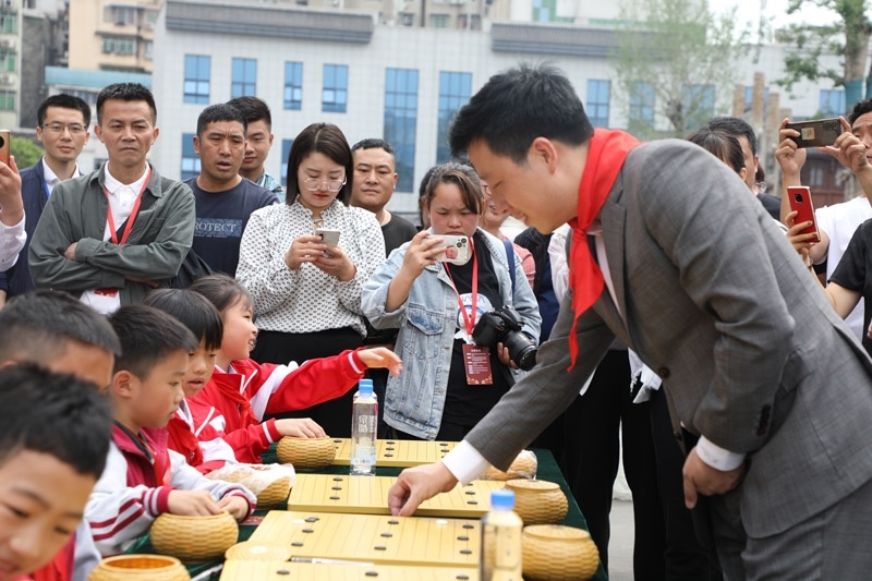 人民網(wǎng)銅仁5月15日電 (記者李乃妍)5月14日,第十屆中國(guó)女子圍棋甲級(jí)聯(lián)賽希望教室捐贈(zèng)儀式和指導(dǎo)棋活動(dòng)在銅仁市梵凈書(shū)院進(jìn)行,中國(guó)圍棋協(xié)會(huì)主席林建超等出席活動(dòng)并發(fā)言。世界冠軍古力、孔杰、馬曉春等與當(dāng)?shù)匦∑逋轮笇?dǎo)棋。