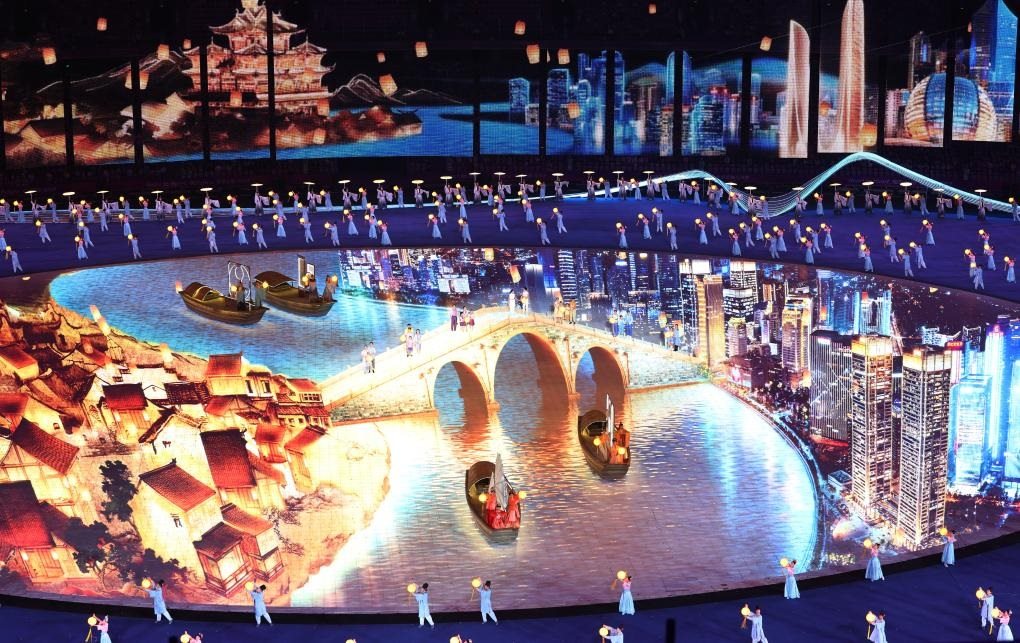 開幕式現(xiàn)場出現(xiàn)了杭州拱宸橋的形象。始建于1631年的拱宸橋,是京杭大運河南端的標(biāo)志性建筑。2014年6月,中國大運河成功申報世界文化遺產(chǎn),拱宸橋作為運河水工建筑,成為一處遺產(chǎn)點。