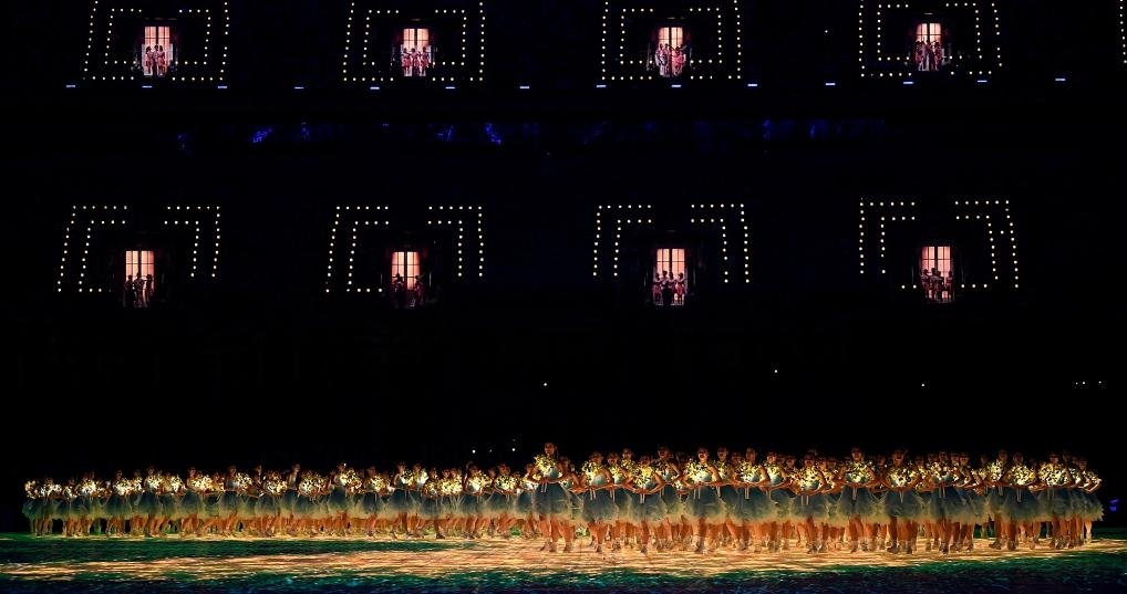歌聲高潮處,觀眾席中近百扇“幸福之門”同時開啟。全場萬人合唱,現(xiàn)場每一名觀眾都成為開幕式“主角”,傳達(dá)“亞洲一家攜手同行”的美好愿望。