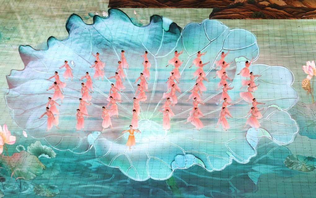 地屏上,錯落有致的立體山水映襯著江南朦朧的裸眼3D視效,營造出輕煙繚繞、水光瀲滟的江南畫境。國風(fēng)男子揮毫作畫,風(fēng)雅錢塘展現(xiàn)在觀眾眼前。煙雨西湖上,碩大的蓮葉舒展,清雅雋秀的女子翩然起舞,仿若盛開的蓮花。