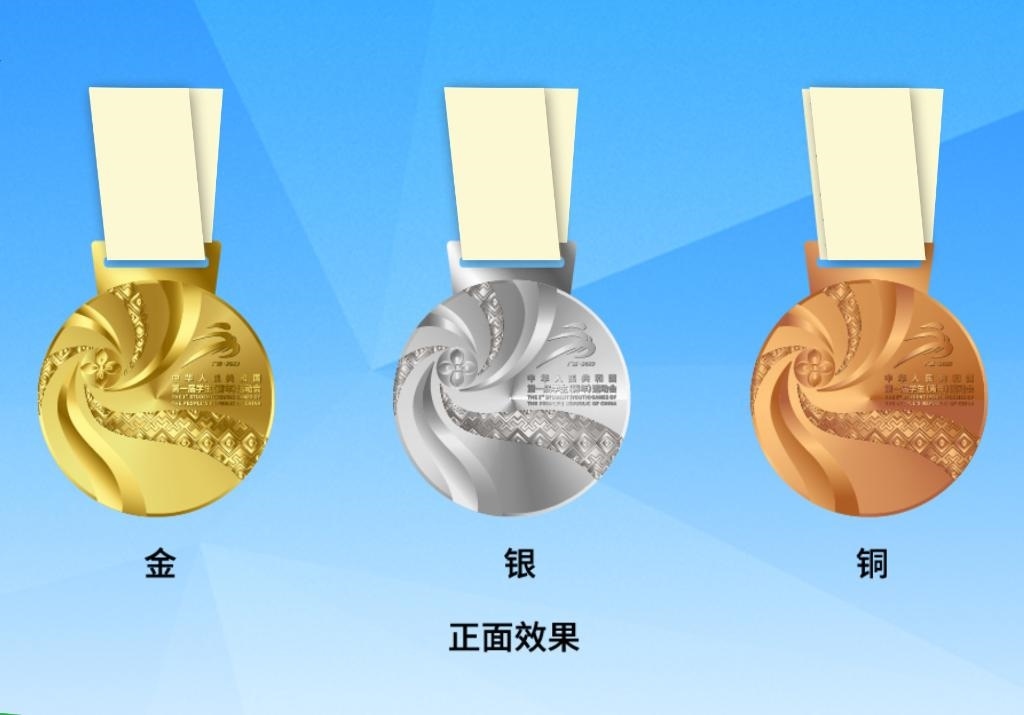 首屆學(xué)青會獎牌正面采用繡球、壯錦等廣西元素,以繡球為設(shè)計焦點(diǎn),通過壯錦飄帶向外綻放,如一朵盛開的鮮花,表達(dá)歡迎四方友人共赴學(xué)青盛會的美意;獎牌背面以廣西銅鼓鼓面為原型,中心太陽紋象征著年輕人的活力和熱情,四方配以圖騰鳥,有著吉祥的寓意;外圈環(huán)繞了學(xué)青會的英文名稱和銅鼓經(jīng)典紋飾云雷紋。獎牌整體寓意“團(tuán)結(jié)、活力、綻放”。