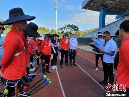 國家體育訓(xùn)練南方基地(海南白沙·綜合),國家射箭隊(duì)教練團(tuán)隊(duì)在點(diǎn)評運(yùn)動(dòng)員當(dāng)日的訓(xùn)練表現(xiàn)。中新網(wǎng)記者王曉斌攝