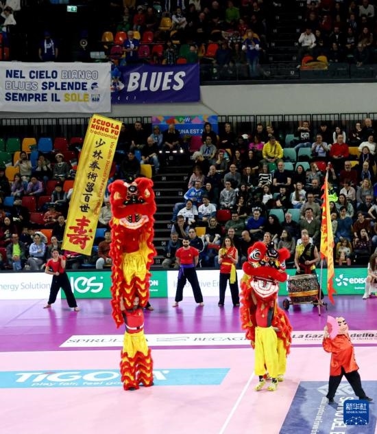 這是2月4日在意大利斯坎迪奇排球俱樂部主場體育館拍攝的比賽局間休息時間的舞獅表演。新華社記者 李京 攝