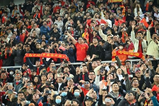 據(jù)主辦方介紹,天津奧體中心體育場(chǎng)的球票基本銷(xiāo)售一空,有42977名觀眾到場(chǎng)為中國(guó)隊(duì)助威。比賽在晚上8點(diǎn)開(kāi)球,結(jié)束已是10點(diǎn)左右。初春夜晚加之冷風(fēng),寒意十足,但球迷的熱情和助威貫穿全程。
