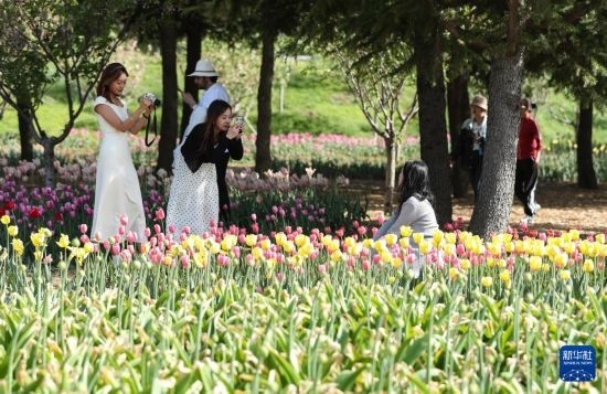 5月11日,游客在大連英歌石植物園游覽拍照。