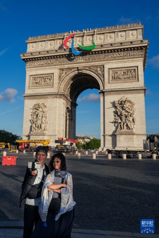 6月28日,游客在懸掛有殘奧會標(biāo)志的法國巴黎凱旋門附近拍照留念。新華社記者 許暢 攝
