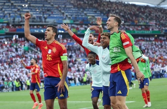 7月5日,西班牙隊(duì)球員賽后慶祝比賽勝利。新華社記者 白雪飛 攝